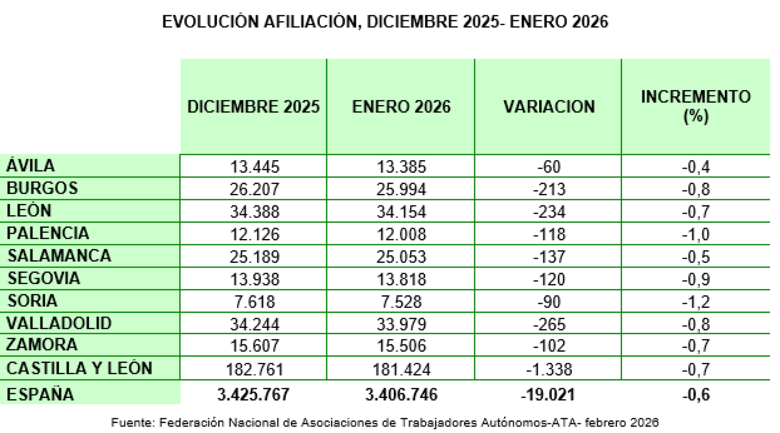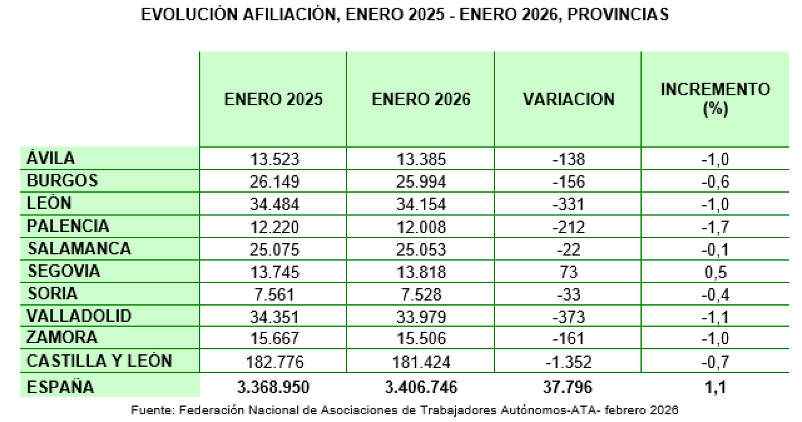 Si se desglosan los datos por provincias se comprueba cómo las nueve perdieron autónomos en el primer mes de 2026, siendo en términos relativos Soria (-1,2%) y Palencia (-1%) las que mayor pérdida han registrado.
