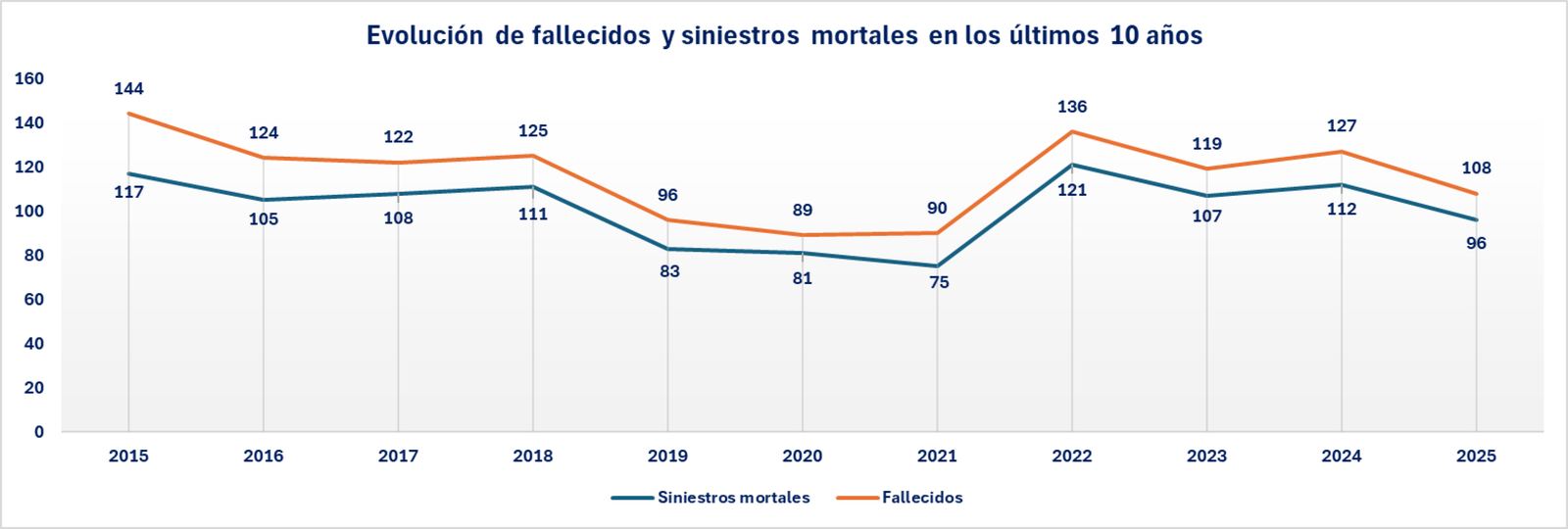 Nota: Las cifras presentadas son provisionales y referidas sólo a los siniestros mortales ocurridos en vías interurbanas y víctimas registradas hasta las 24 horas posteriores a producirse el siniestro Las cifras definitivas ya consolidadas, que incluirán las victimas a 30 días de accidentes ocurridos en vías urbanas e interurbanas, permitirán tener la radiografía completa de la siniestralidad vial en 2025.