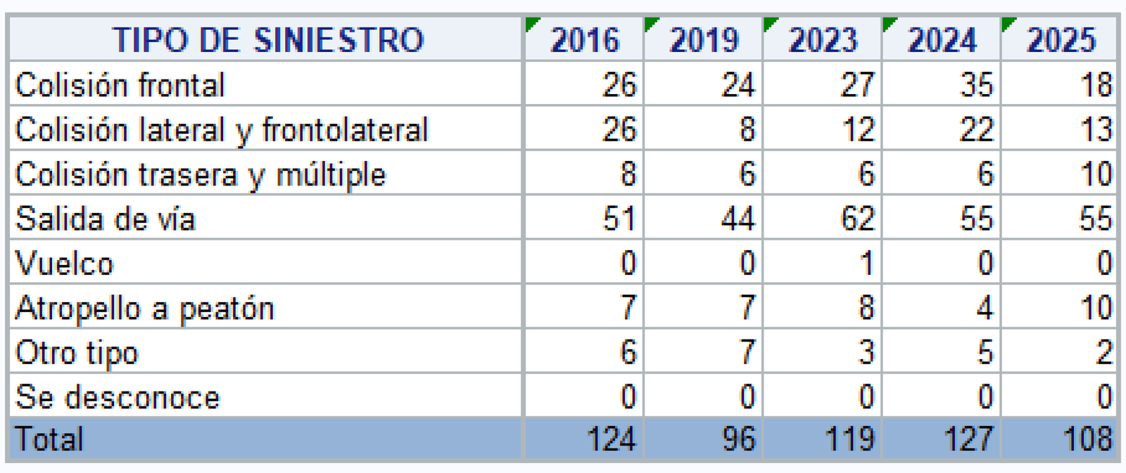 Según el tipo de siniestro, la salida de vía es el tipo de siniestro con mayor número de personas fallecidas (55), misma cifra que el año anterior, representando el 51 por ciento del total. Por su parte, las colisiones frontales concentran el 17 por ciento de las personas fallecidas (18), una disminución del 49 por ciento (-17) respecto al 2024.