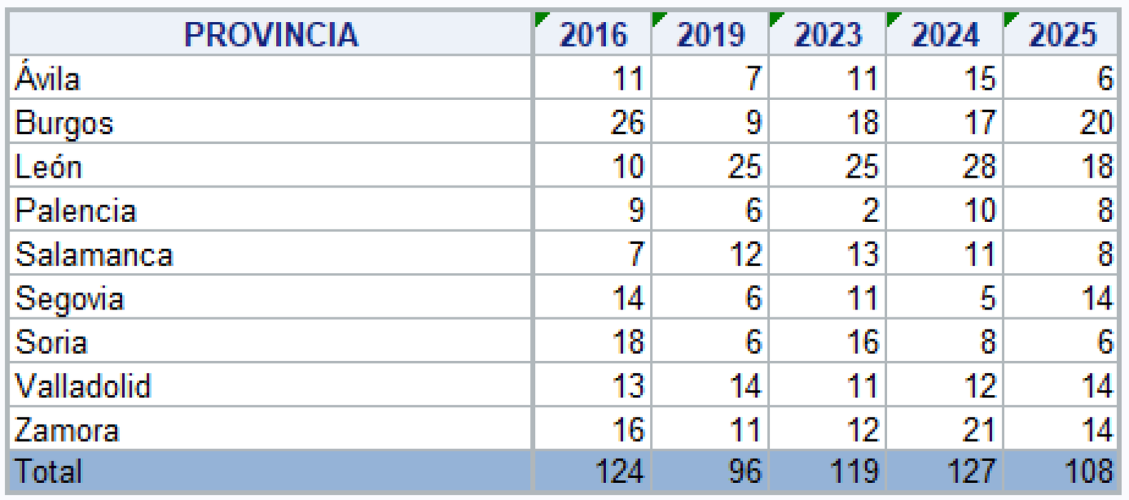 En las provincias de Burgos, Segovia y Valladolid el número de fallecidos aumentó respecto a 2024; destacando Segovia con 9 fallecidos más.