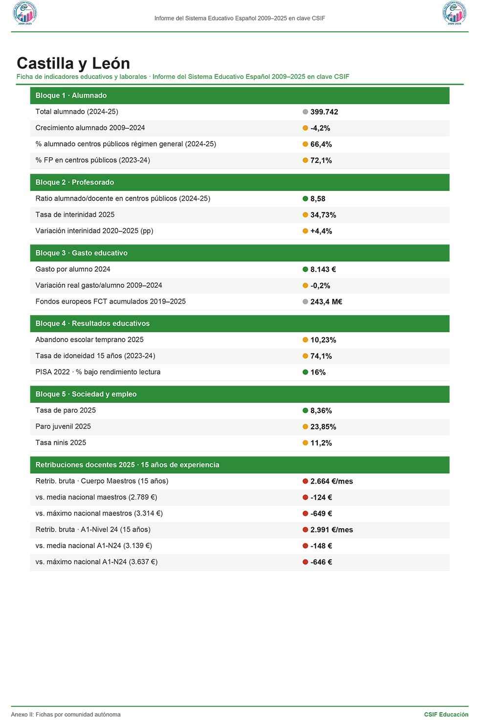 • Fractura entre comunidades autónomas en gasto por alumno, abandono escolar y brecha salarial docente.