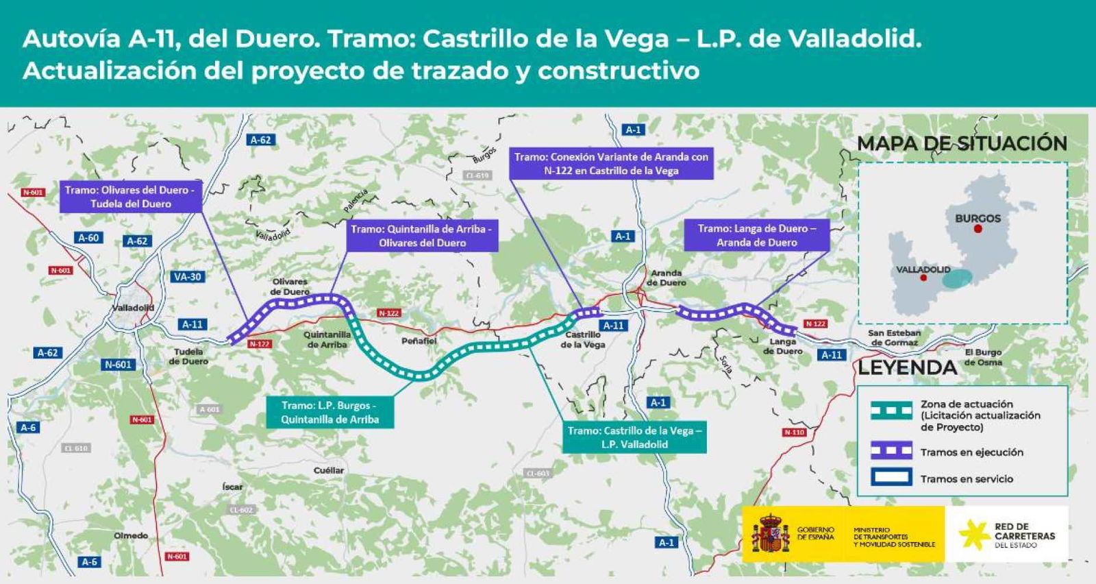 El Ministerio de Transportes y Movilidad Sostenible ha adjudicado por 2,6 millones de euros (IVA incluido) el contrato de servicios para la actualización de los proyectos de trazado y constructivos de la Autovía A-11 entre Castrillo de la Vega y el límite provincial de Valladolid, en la provincia de Burgos.