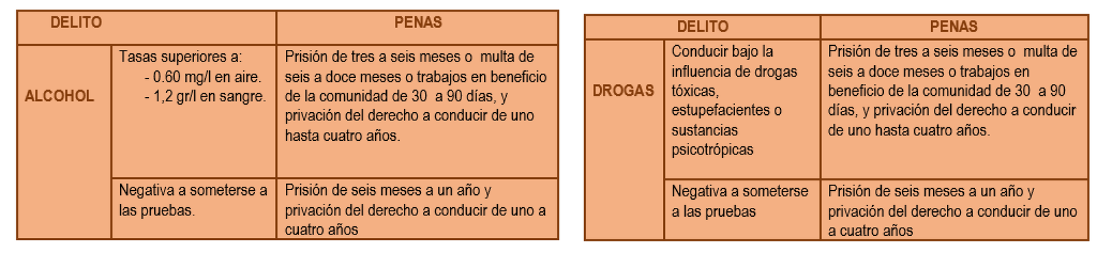 Por su parte, el capítulo IV del Título XVII del Código Penal tipifica los delitos contra la seguridad del tráfico y establece las siguientes penas por conducir con exceso de alcohol o bajo la influencia de drogas tóxicas, estupefacientes o sustancias psicotrópicas.