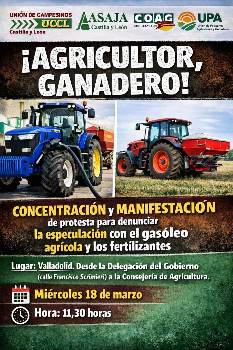 Las organizaciones profesionales agrarias de Castilla y León, ASAJA, UCCL y la ALIANZA UPA-COAG, han convocado mañana miércoles en Valladolid una concentración y manifestación para denunciar la especulación creciente en el mercado del gasóleo agrícola y los fertilizantes.