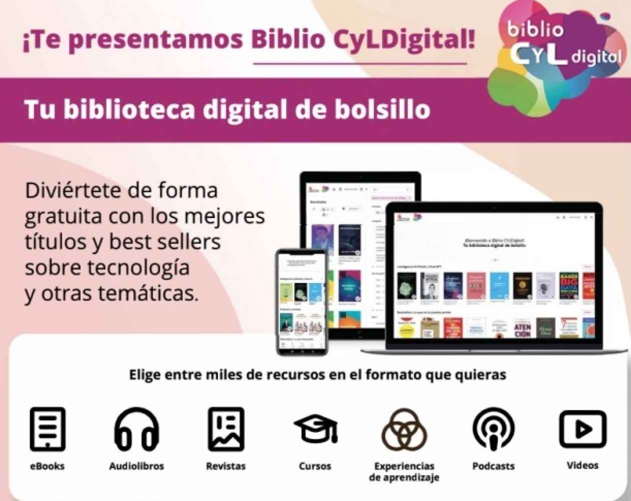 Biblio CyLDigital es la biblioteca digital gratuita de la Junta de Castilla y León y ofrece a la ciudadanía ebooks, audiolibros, cursos, vídeos, podcasts y revistas especializadas para impulsar el aprendizaje permanente.