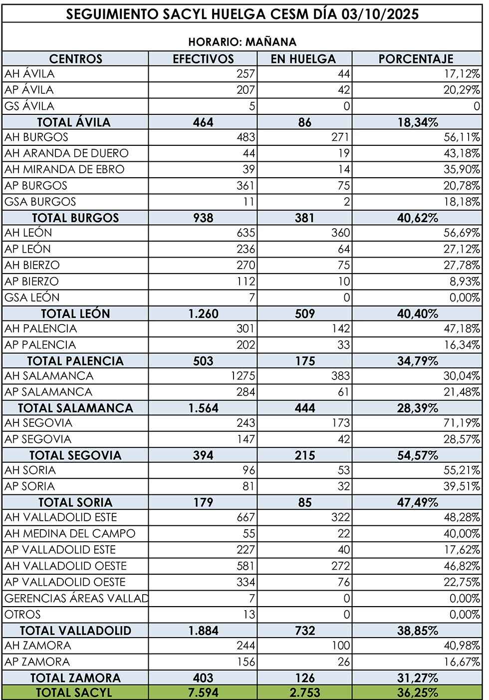 En concreto, han secundado la huelga un total de 2.753 facultativos de los 7.594 efectivos disponibles hoy en el turno de mañana. Por provincias, el seguimiento ha sido el siguiente: Ávila 18,34 %, 86 médicos en huelga; Burgos 40,62 %, 381 en huelga; León 40,4 %, 509; Palencia 34,79 %, 175 médicos; Salamanca 28,39 %, 444 facultativos; Segovia 54,57 %, 215; Soria 47,49 %, 85; Valladolid 38,85 %, 732 médicos; y Zamora 31,27 %, 126 médicos en huelga.