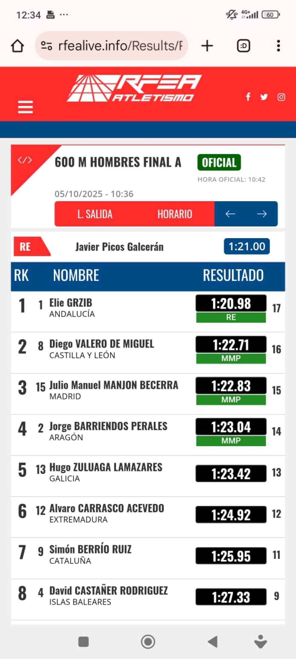 En 600 ml, Diego Valero, ha sido segundo con una marca de 1:22;71