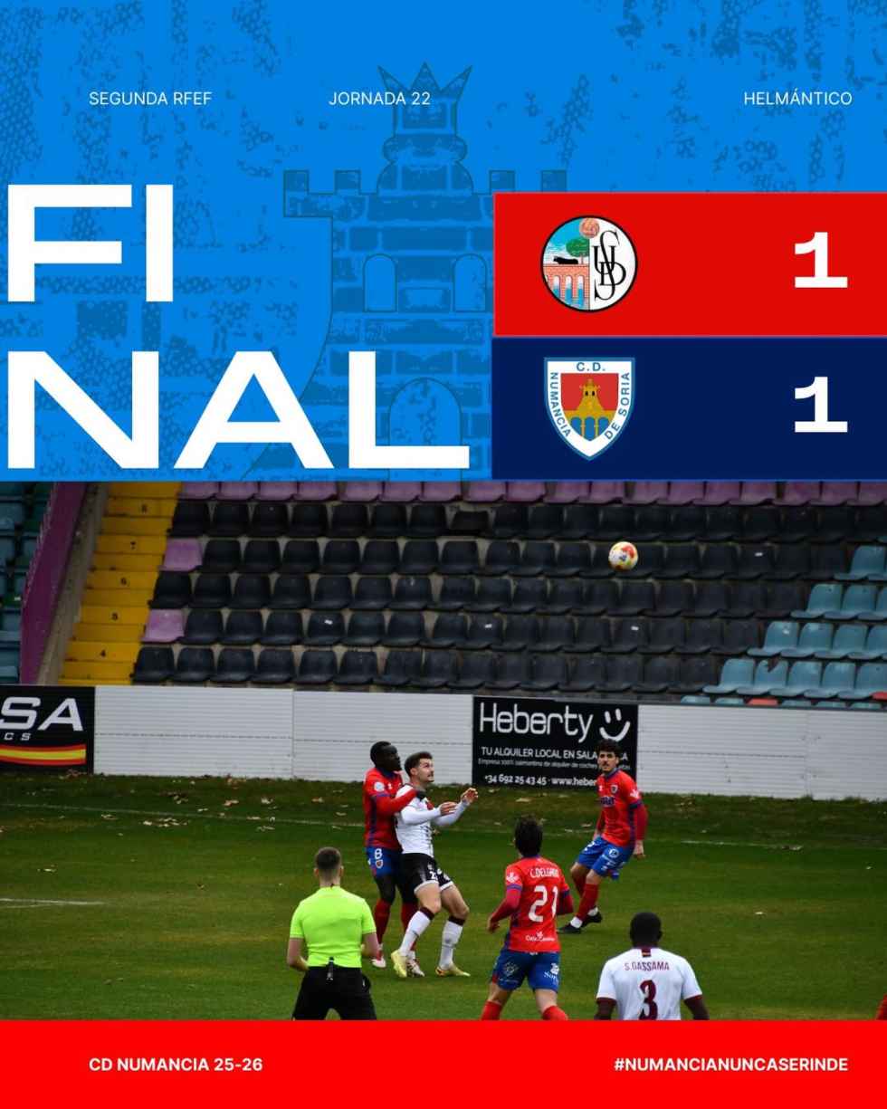 El Numancia sigue sin reaccionar y salir de su errática trayectoria del año 2026. En Salamanca, sólo han sumado un empate, a pesar de jugar la última media hora con un jugador más.