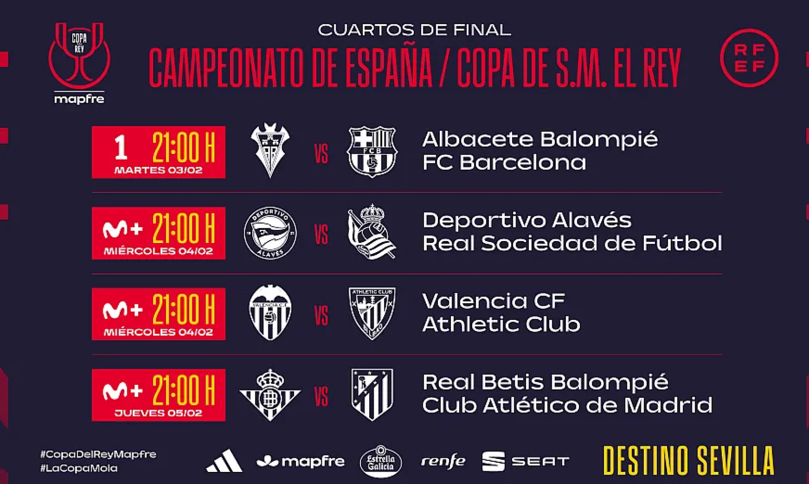 Del 3 al 5 de febrero, se disputarán cuatro partidazos antes de dibujar las semifinales del torneo más bonito del fútbol español. Unas semifinales, como ya se sabe, que se celebraran a ida y vuelta.