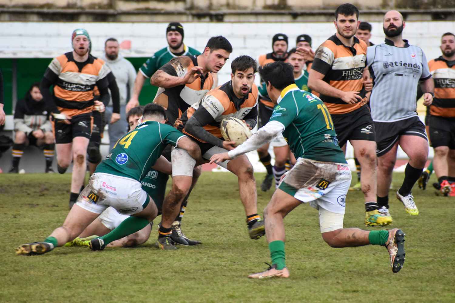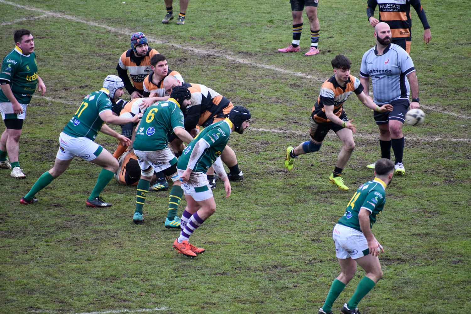 El partido arrancó con un inicio complicado para los locales. Quebrantahuesos golpeó muy pronto, adelantándose con un ensayo transformado en el minuto 2 (0-7) y ampliando su ventaja con un segundo ensayo en el minuto 13 (0-12).
