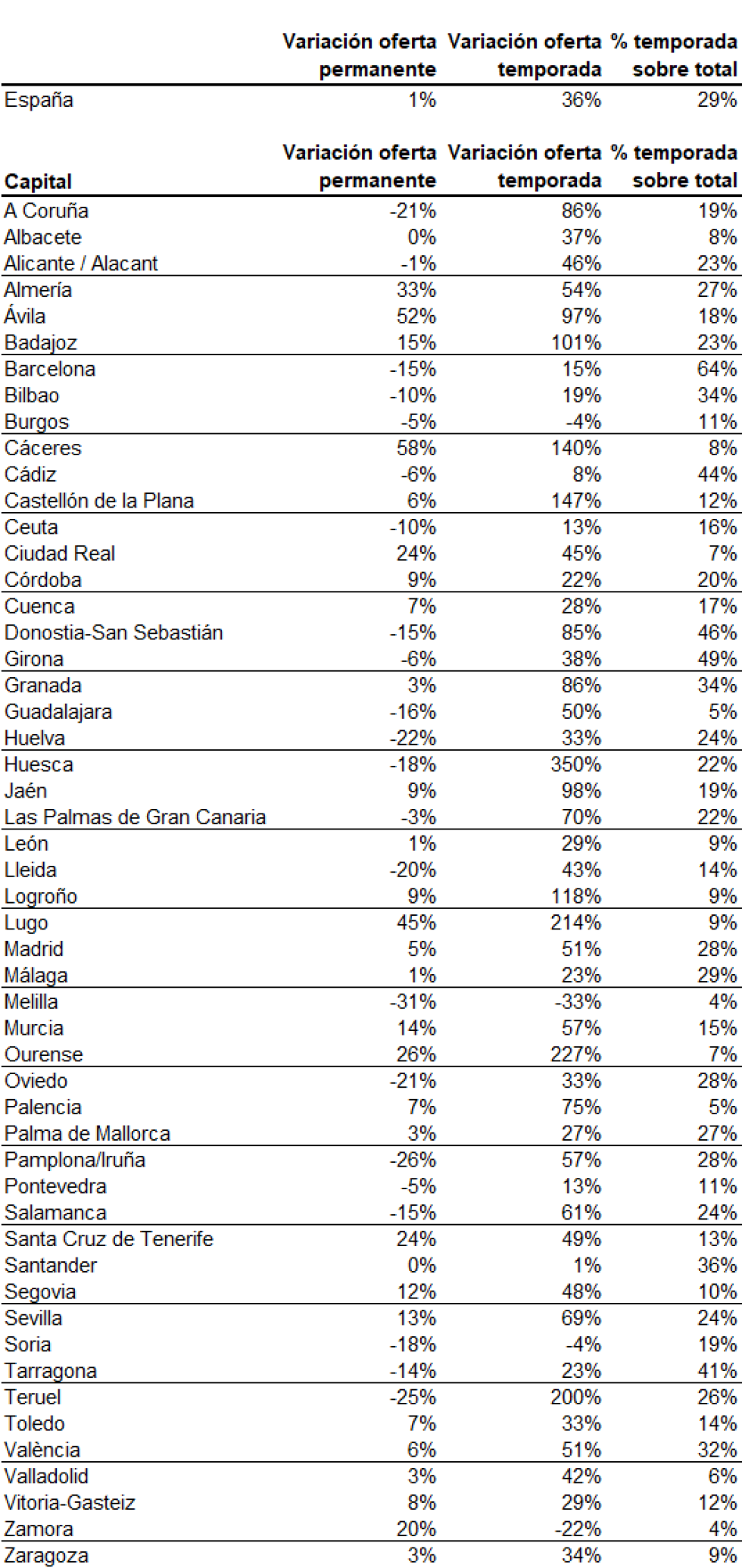Por el contrario, en 4 capitales el volumen de alquileres de temporada se ha reducido este año: Melilla (-33%), Zamora (-22%), Burgos y Soria (-4% en las DIS ciudades).