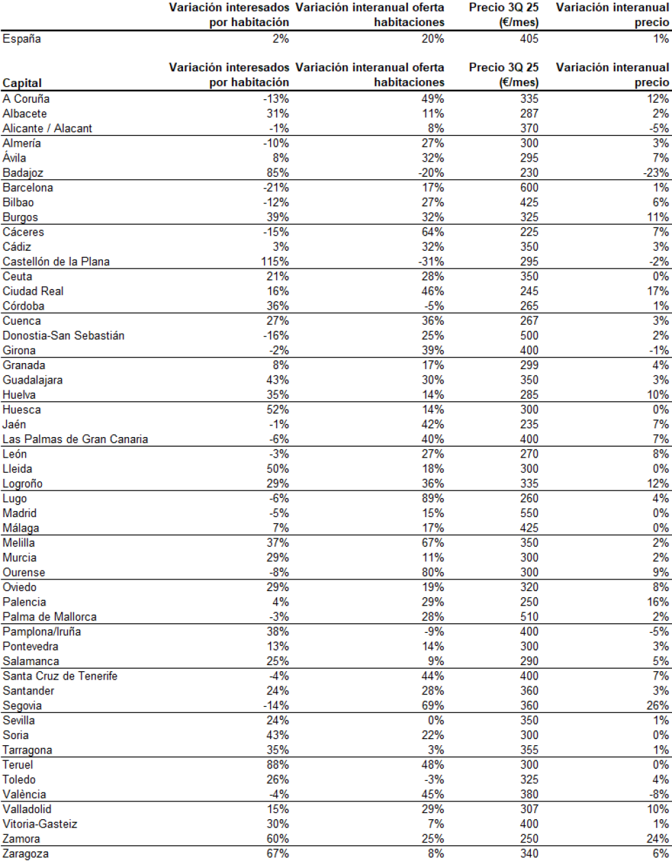 El número de personas interesadas por cada habitación ha crecido un 2% en el último año. Son 16 las capitales que han experimentado subidas superiores al 30%, siendo Castellón de la Plana (115%), Teruel (88%), Badajoz (85%), Zaragoza (67%), Zamora (60%) y Huesca (52%).