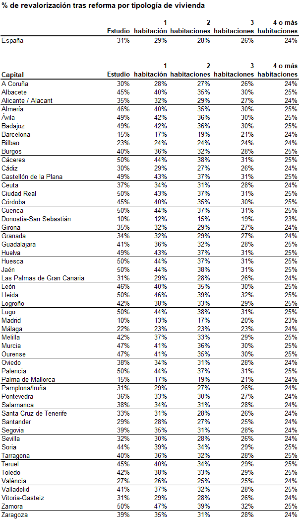En el resto de capitales españolas, la tendencia de la revalorización es similar a la nacional, decreciendo en función del aumento del tamaño de la vivienda.