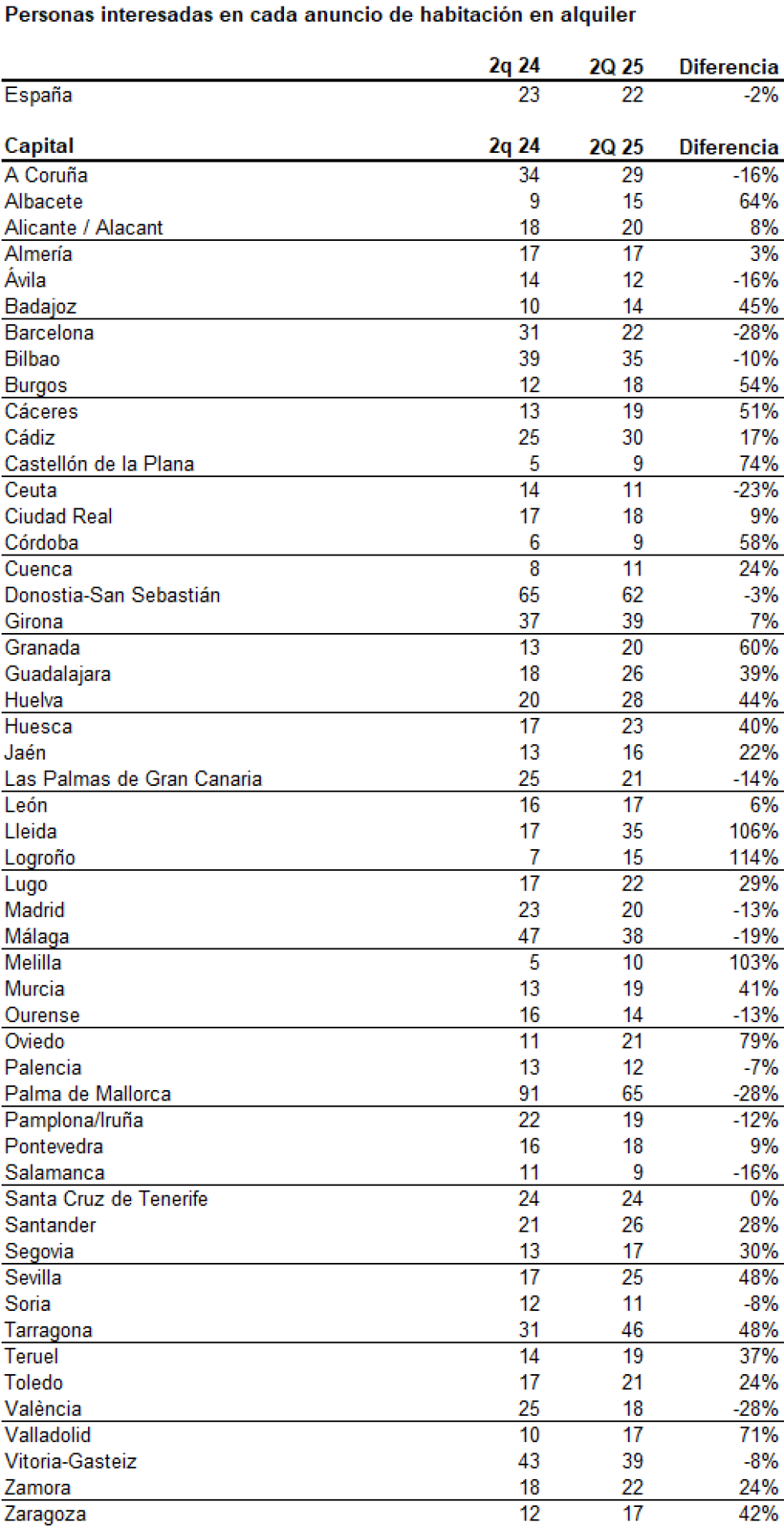 El número de personas interesadas en cada habitación se ha reducido un 2% a nivel nacional, pero han sido 34 las capitales en las que ese número ha crecido.
