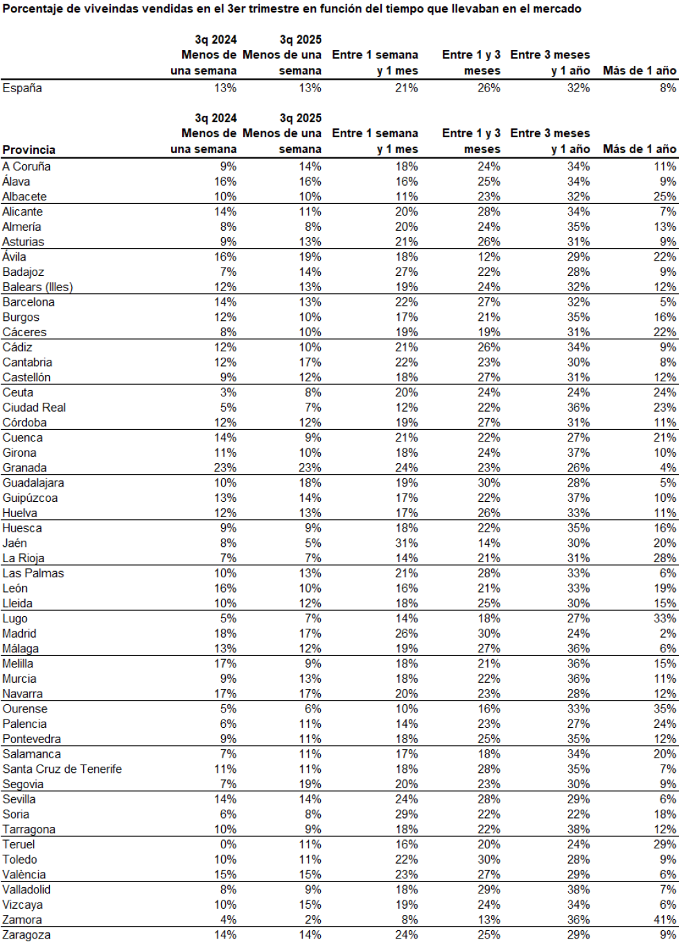 El porcentaje de viviendas vendidas en menos de una semana, denominado “ventas exprés”, se ha mantenido estable en el último año, ya que en el tercer trimestre de 2024 se situaba también en el 13 por ciento.