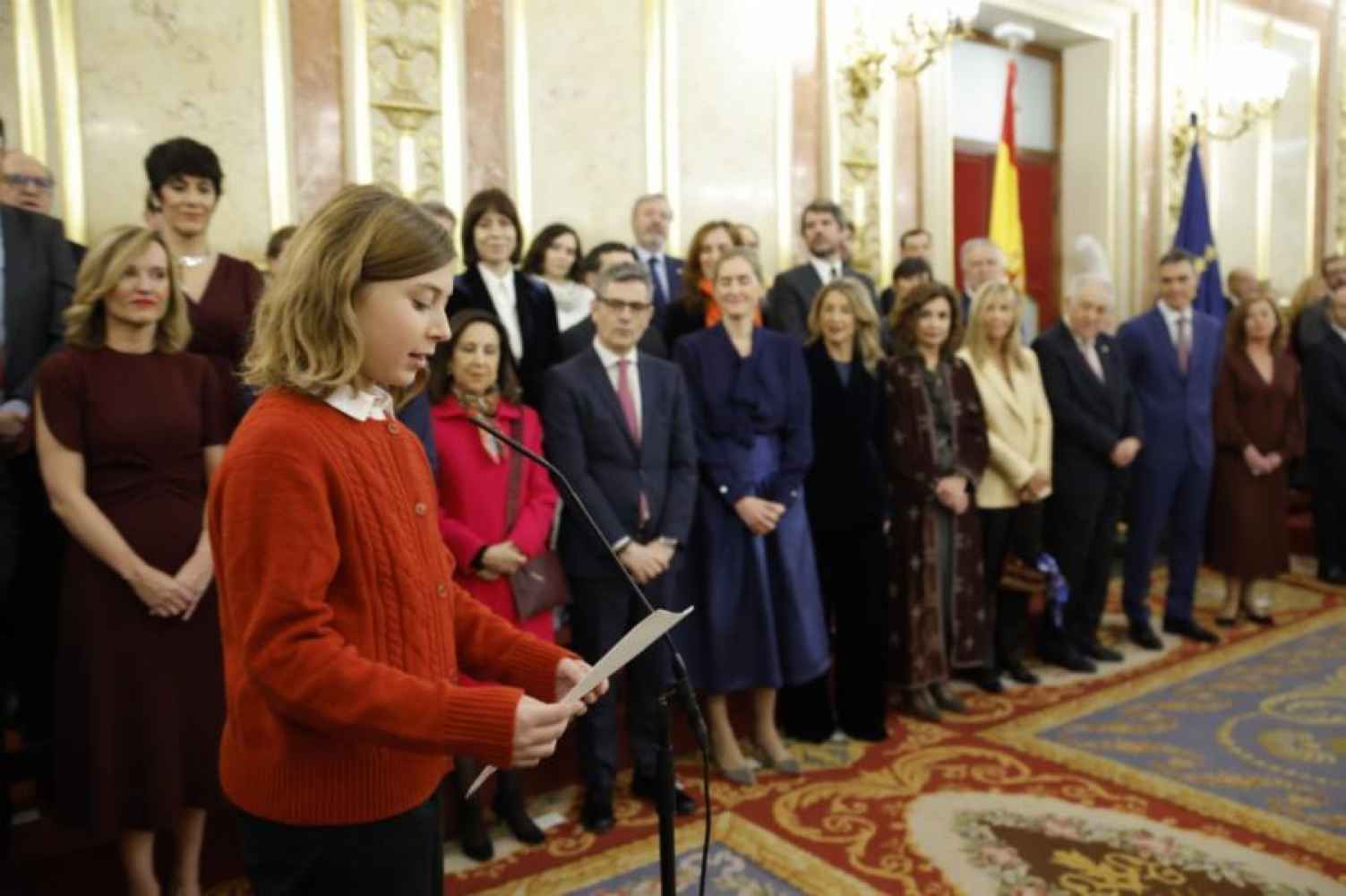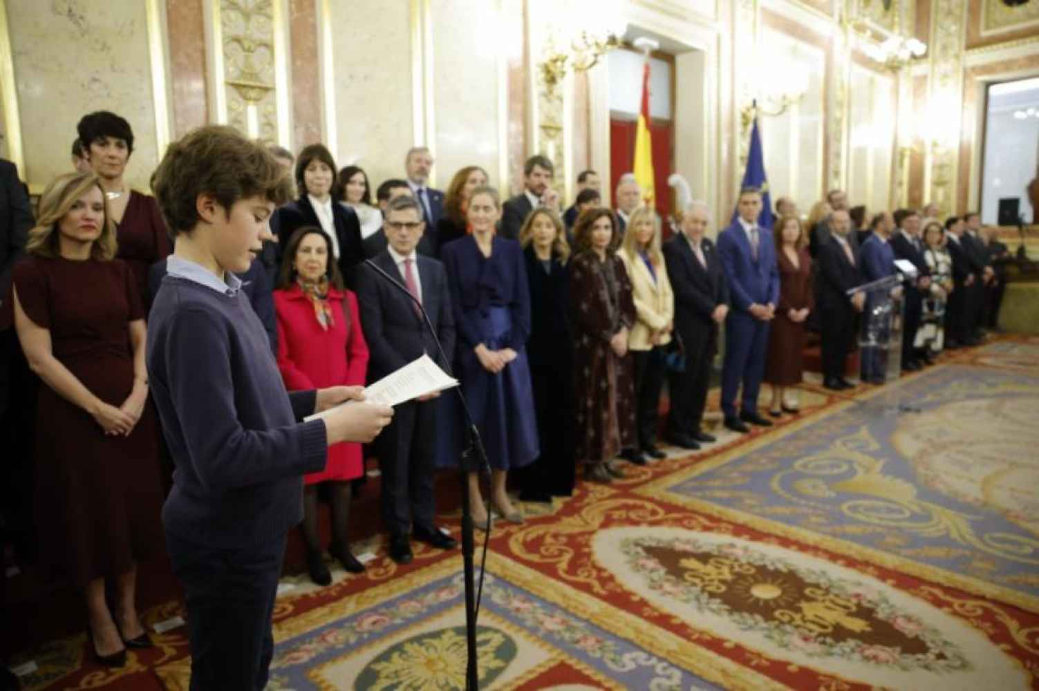 A continuación, niños alumnos de Primaria de distintas nacionalidades europeas han dado lectura a tres artículos de la Constitución. Paula Martínez Gernhardt y Camilo Cuesta Aschenberg han leído en alemán el artículo 23; que reconoce el derecho a la participación política ciudadana. Luego, Gael Camus Nogales y Mariam Belayachi Chaves han leído en francés el artículo 27; que regula el derecho a la educación, y, seguidamente, Emma Tutone Montilla ha recitado en italiano el artículo 48, dedicado a la juventud.