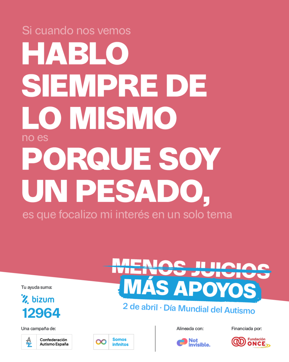 Financiada por Fundación ONCE, esta campaña propone que, en lugar de sentenciar que alguien es borde, pesado o maleducado, nos paremos a pensar que, detrás de un comportamiento que no nos encaja o que no se ajusta a nuestras expectativas, puede haber una persona autista que necesita nuestro apoyo y nuestra comprensión para hacer frente a una situación que le genera malestar o que, simplemente, no sabe gestionar.