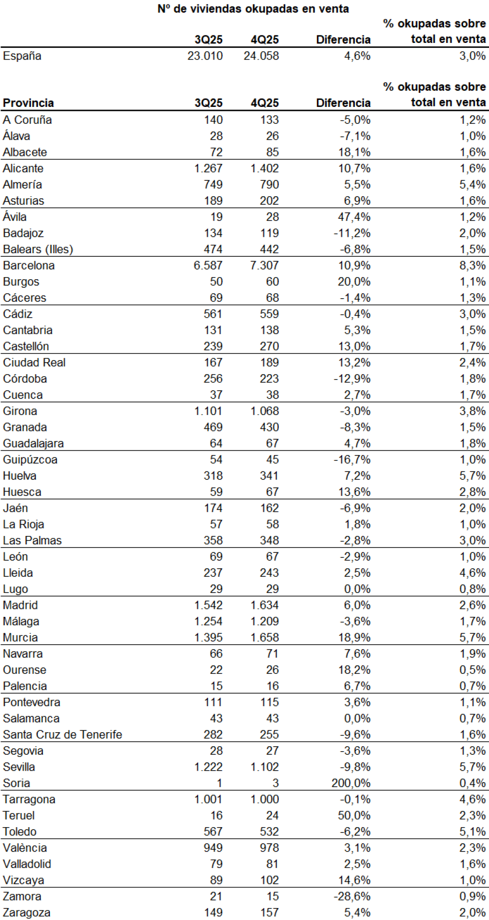 En el caso de las provincias la situación es muy similar, con Barcelona como la que tiene un mayor volumen de casas okupadas en el mercado: 7.307 viviendas.