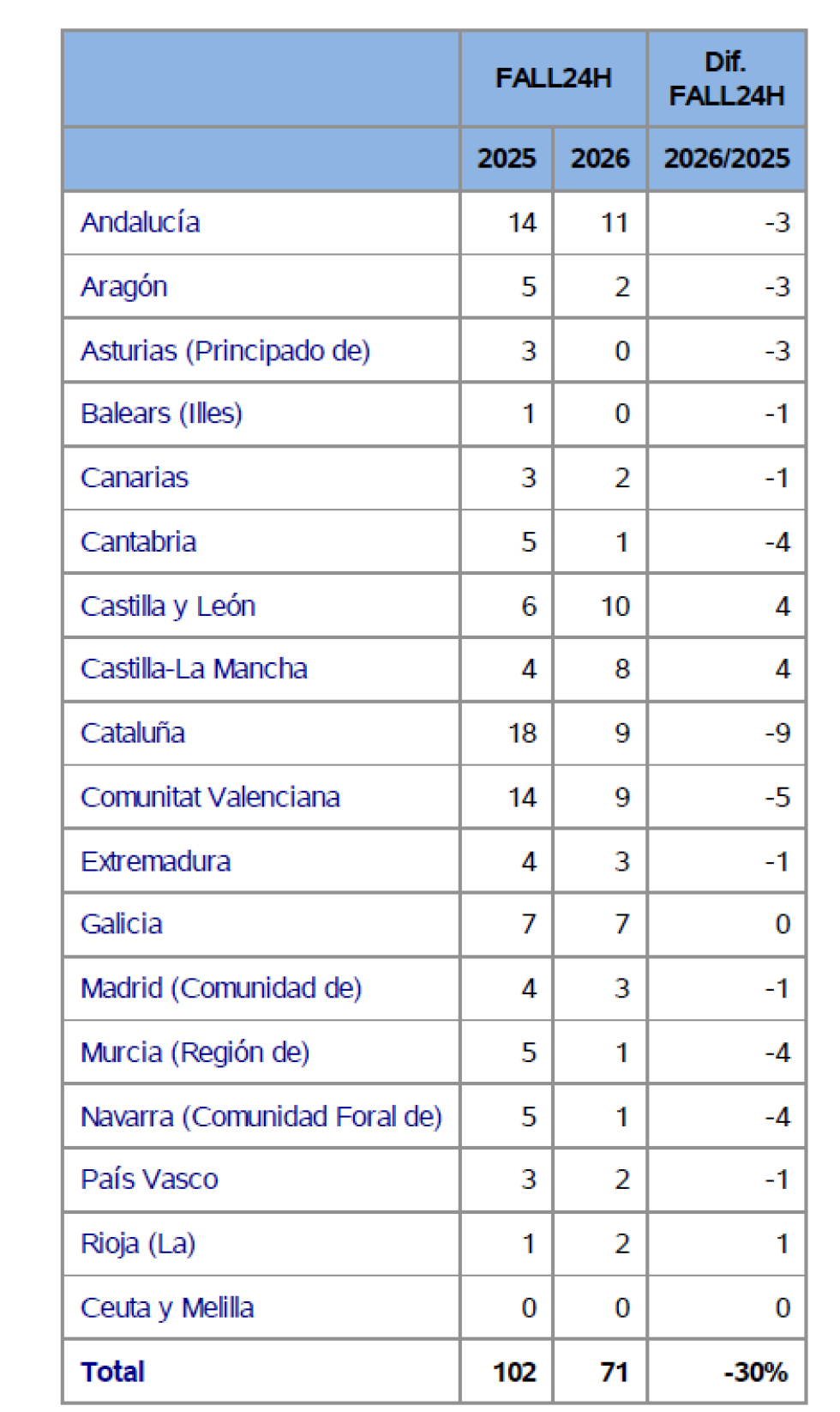 En cuatro comunidades autónomas ha aumentado el número de fallecidos (Castilla y León, Castilla la Mancha, Extremadura y Galicia) mientras que en el resto ha descendido.