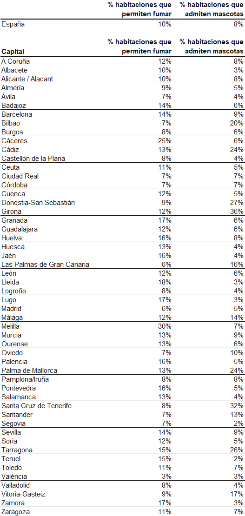 Hay 14 capitales de provincia en las que el porcentaje de habitaciones que admiten mascotas es superior a las que admiten fumadores. Se trata de Santa Cruz de Tenerife, Girona, San Sebastián, Bilbao, Tarragona, Palma, Cádiz, Las Palmas de Gran Canaria, Vitoria, Santander, Oviedo y Málaga. En Pamplona, Córdoba, Ciudad Real y Valencia el peso de ambas restricciones es igual.