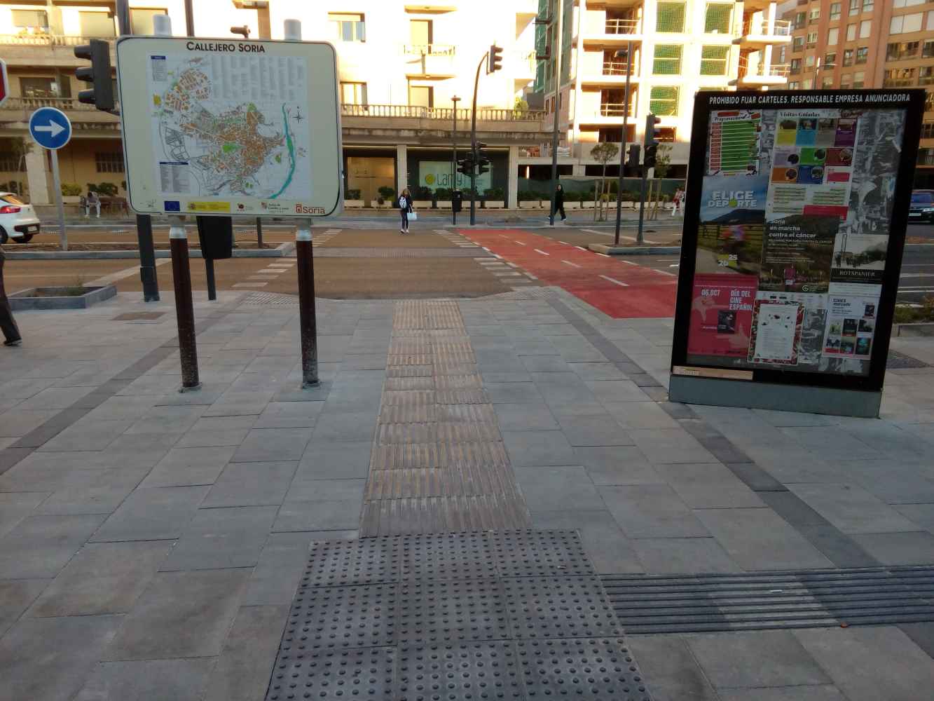 Con la generalización de las franjas de pavimento táctil diferenciado se crea en las personas invidentes la duda de en qué situación se encuentran, inclinándoles a caminar por el centro de las aceras cuando lo suyo sería hacerlo, en mejores condiciones de seguridad, junto a las fachadas. Sólo se me ocurren dos posibles explicaciones de tamaño disparate. O bien se ha copiado un proyecto de aceras para alguna carretera sin edificaciones adyacentes, o los responsables de los proyectos y las obras son unos incompetentes en cuyas manos, sea cual sea la explicación, nunca debió estar la responsabilidad de su ejecución o dirección facultativa. Algo tendría que decir el Director de las obras del Ministerio de Transportes (Jefe de Carreteras del Estado en Soria)  y algo tendría que decir el responsable de las obras municipales, sea técnico o político. Santa Lucía, diría mi admirada Leonor del Río, se habrá sentido traicionada por la desidia ignorante de los responsables de las obras.
