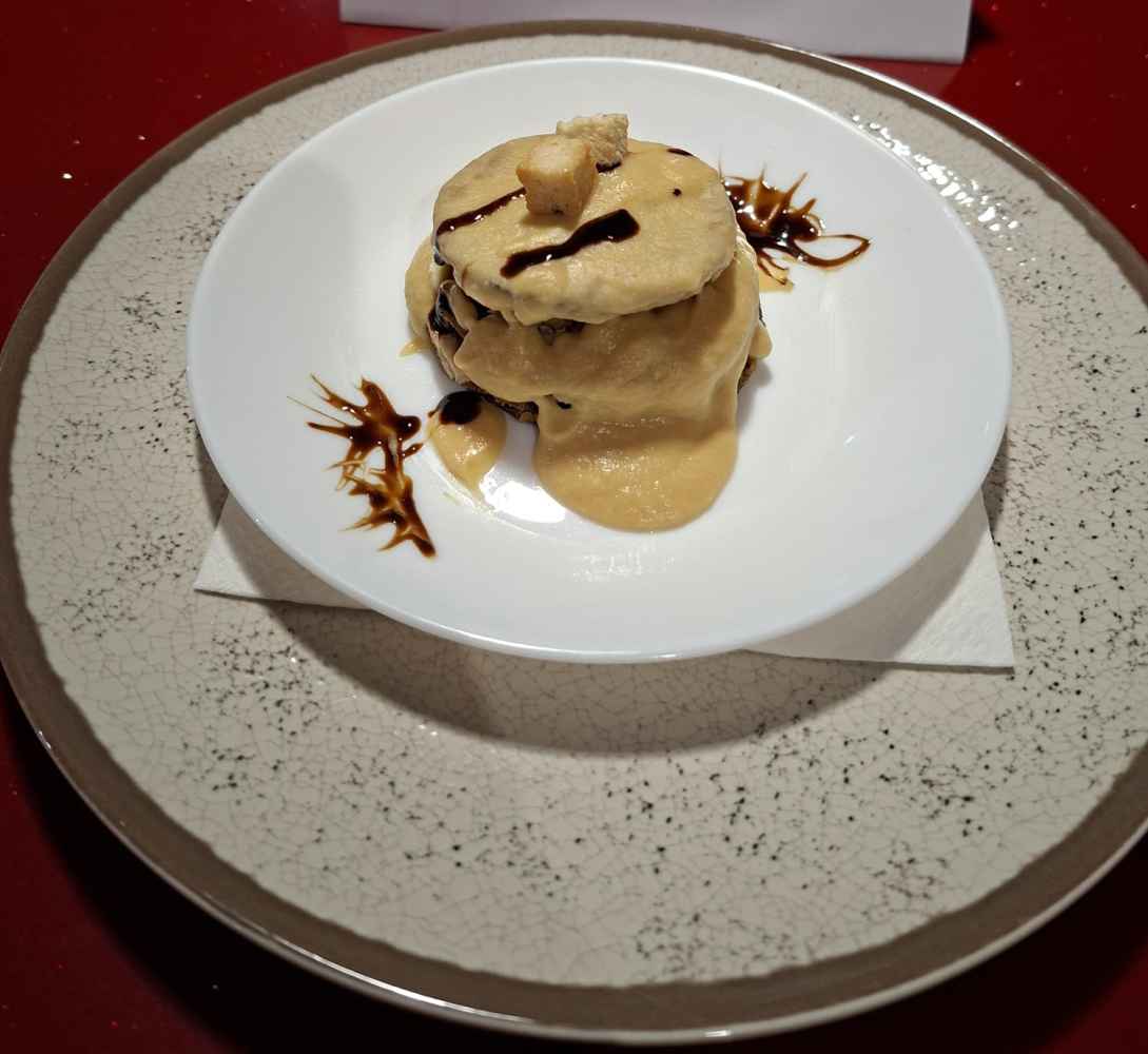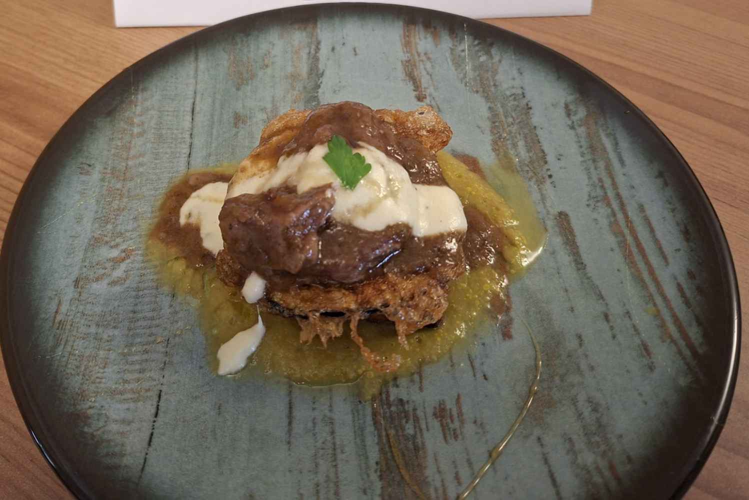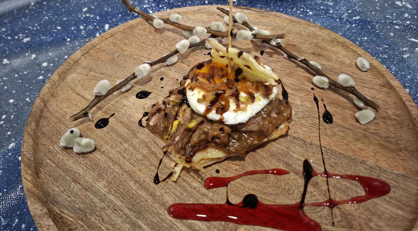 Restaurante Pedro firma 'Las explosiones del Gentil Pedro', un juego de texturas con hojaldre, carrillera, huevo poché y destellos de vino, miel y frutos secos.