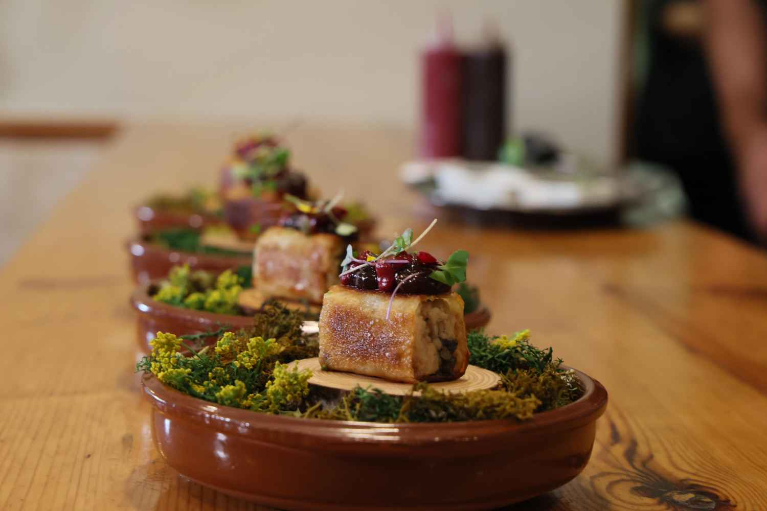 La tapa, un homenaje a Jesús Garín, padre del chef, construyó un discurso culinario a través del conejo a la brasa y confitado, duxelle de portobello y trufa, papada ibérica ahumada, pasta filo crujiente, chutney de higo negro y un cremoso de remolacha.