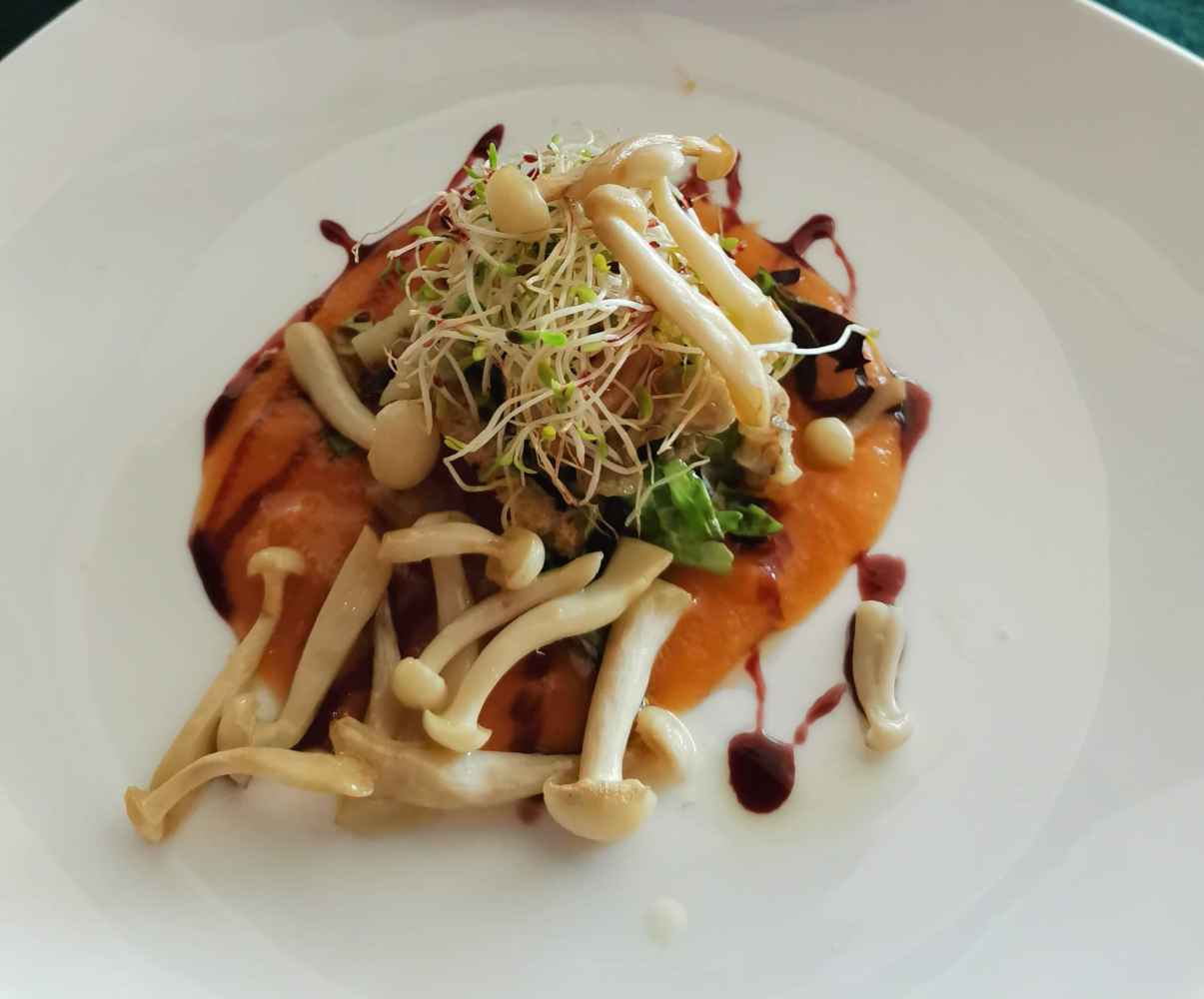 Julia ha creado una base de masa fina de pan y bogavante, coronada con bacalao al pilpil, brotes tiernos de cebolla, una emulsión de vino y un toque final de setas de la tierra.