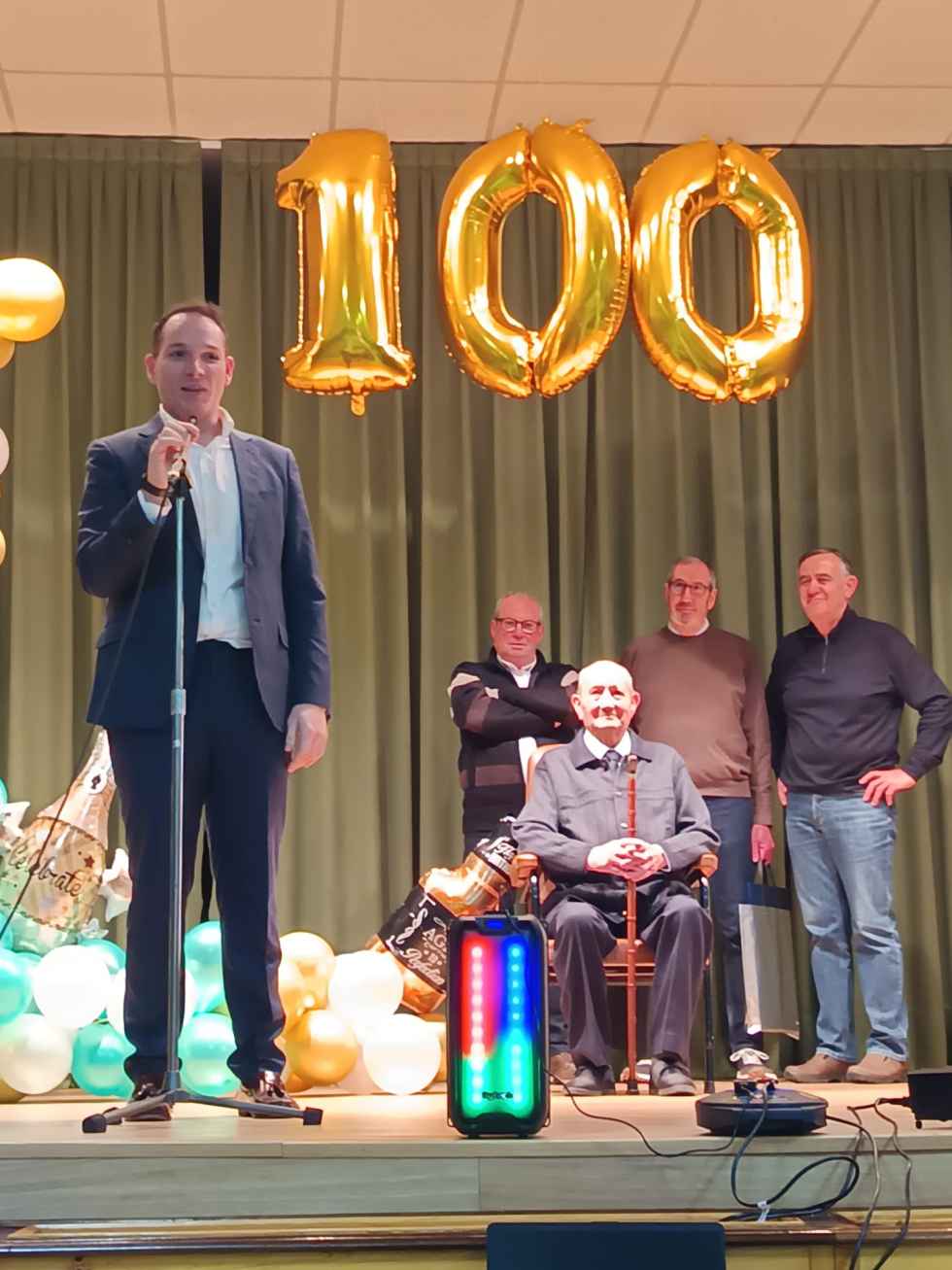 Llega a cien años con buena salud; desplazándose él mismo con ayuda de su bastón, haciendo gimnasia, jugando al bingo, viendo la televisión y conversando con sus compañeros, todo ello gracias a su buena memoria y deseando celebrar el día con sus 4 hijos, 7 nietos, 1 biznieta y los compañeros residentes de la Residencia Santa Cristina.