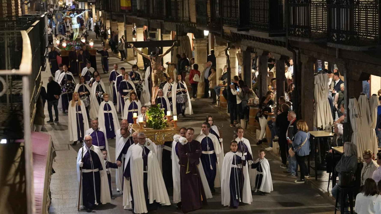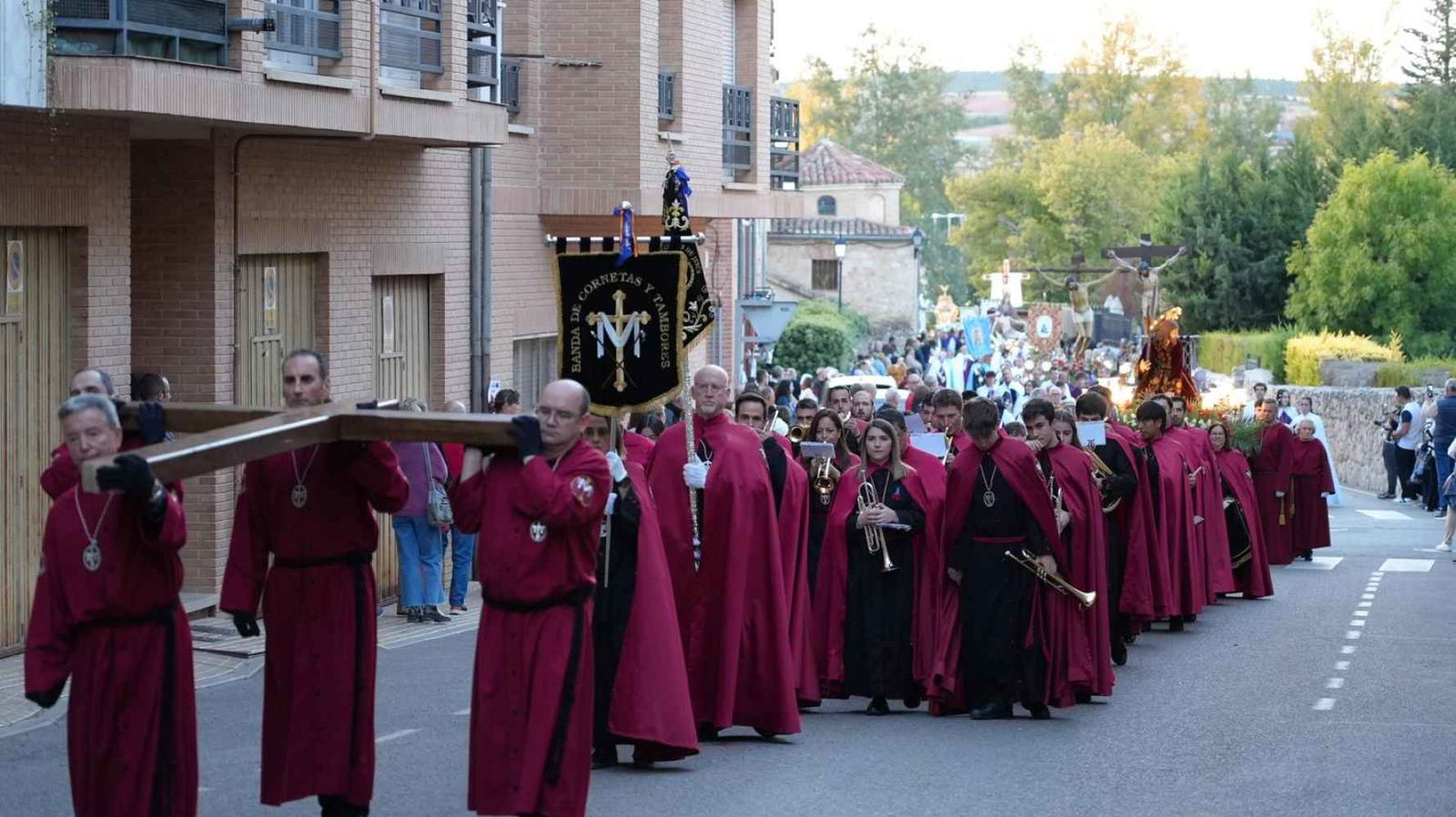 Tras la cruz procesional, el cortejo lo encabezaba la Cofradía Vera Cruz de San Esteban, la más antigua de la Diócesis y lo cerraba el Resucitado de Almazán antes del clero y las autoridades.
