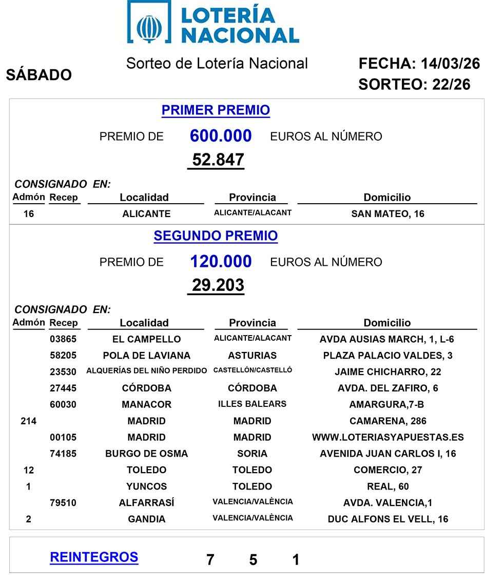En el sorteo de la Lotería Nacional de hoy sábado 14 de marzo de 2026 ha habido un resguardo premiado con el segundo premio, según ha confirmado la delegación en Soria de Loterías y Apuestas del Estado.