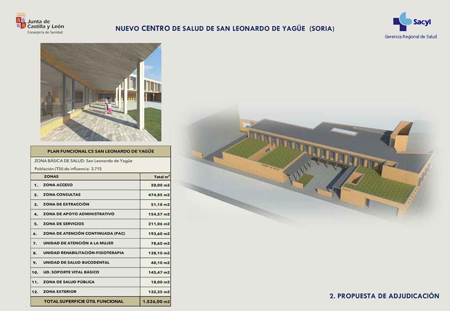 El Plan Funcional diseñado por la Consejería de Sanidad para el futuro Centro de Salud de San Leonardo de Yagüe prevé un total de 101 espacios asistenciales, distribuidos en los 1.523 metros cuadrados útiles estimados, lo que supondrá un incremento sustancial en la calidad de la asistencia prestada a los casi cuatro mil habitantes de esa zona básica de salud, y una mejora en las condiciones para el desempeño de los profesionales, según ha resaltado el consejero de Sanidad, Alejandro Vázquez, en la presentación del proyecto.