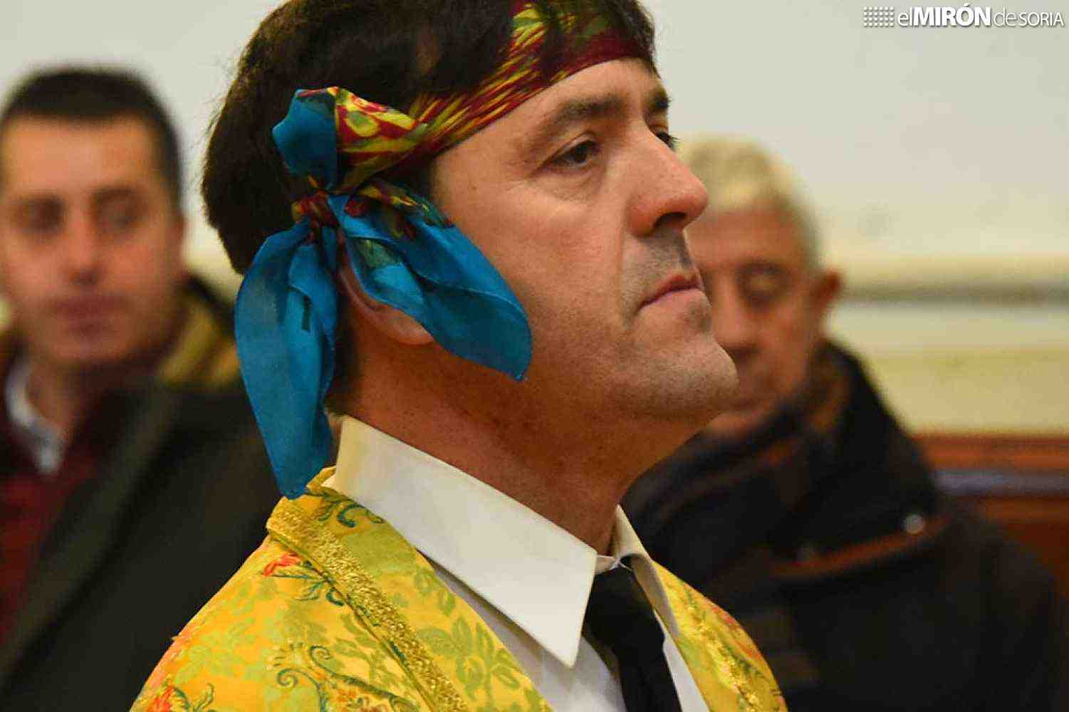 Tras la homilía, el párroco ha dado paso a la tradición. Los dos bobos, nombre que reciben los jóvenes encargados de repartir los palos de madera de acebo y reponerlos en caso de ruptura, se han acercado hasta el altar seguidos de los danzantes ataviados con trajes propios de una época goyesca: pantalones cortos rojos, medias blancas con calados, camisa blanca, corbata negra, chaqueta de estampados florales, pañuelo anudado en la cabeza y capa negra.