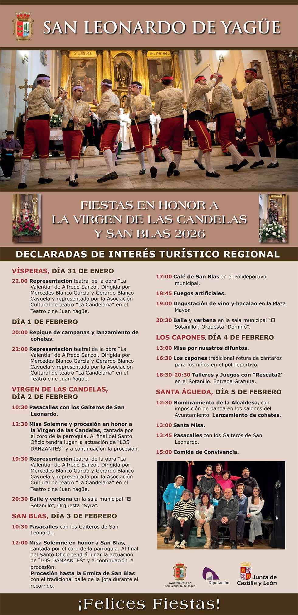 El Ayuntamiento de San Leonardo de Yagüe ha publicado el programa oficial para las fiestas de San Blas y Las Candelas, a primeros de febrero, que estrenarán la condición de fiesta de Interés Turístico Regional.