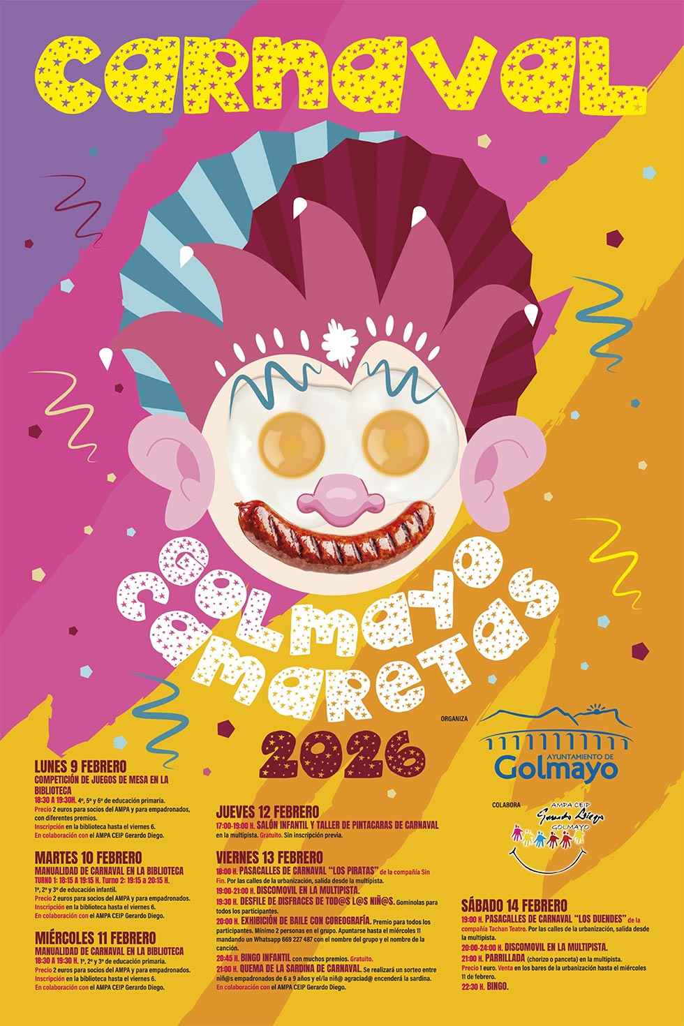 Provincia | Comarca de Soria Golmayo publica el programa para su carnaval 2026 Sábado, 07 Febrero 2026 08:26 El Ayuntamiento de Golmayo ha publicado el programa para celebrar el carnaval 2026 durante la próxima semana. Puede consultarlo a continuación.