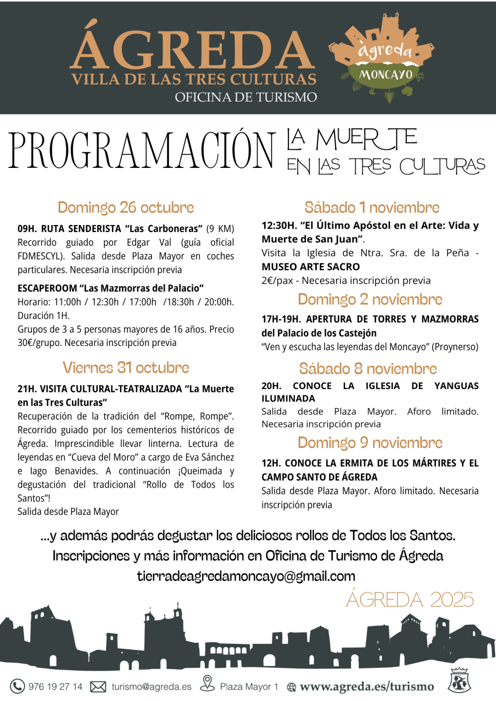 Entre el 26 de octubre y el 9 de noviembre, la Villa de las Tres Culturas acogerá diversas actividades culturales, turísticas y gastronómicas, destacando entre ellas la visita teatralizada “La Muerte en las Tres Culturas”, que recupera desde 2017 la antigua tradición del “Rompe, Rompe”.