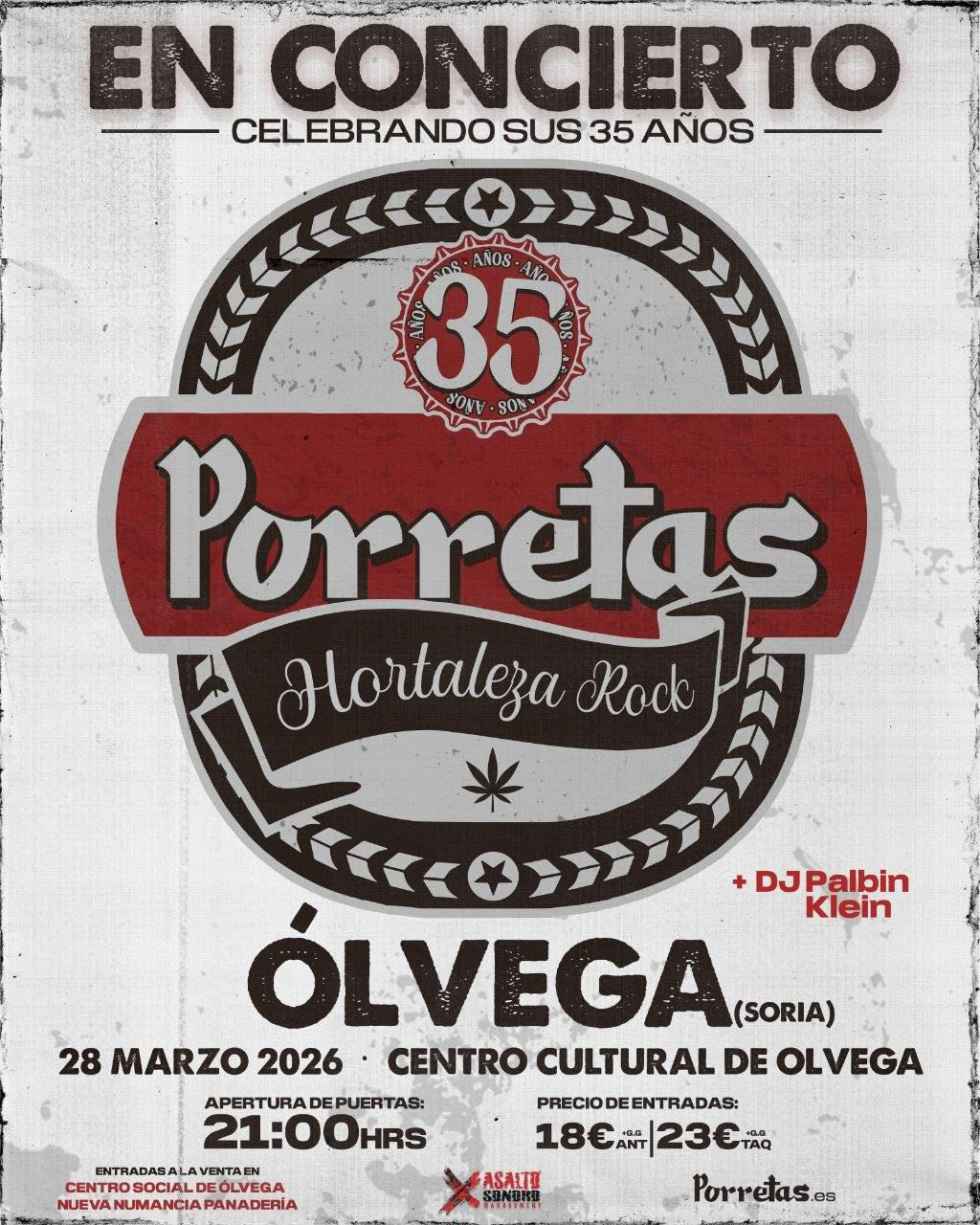 La segunda cita musical llegará el 28 de marzo, en el centro cultural de Ólvega, con el grupo madrileño “Porretas”.