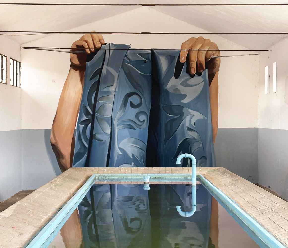 El mural también juega con el reflejo del agua y la arquitectura del lugar, convirtiendo la propia estructura en un gran tendedero visual, en una especie de trampantojo que conecta pasado y presente.