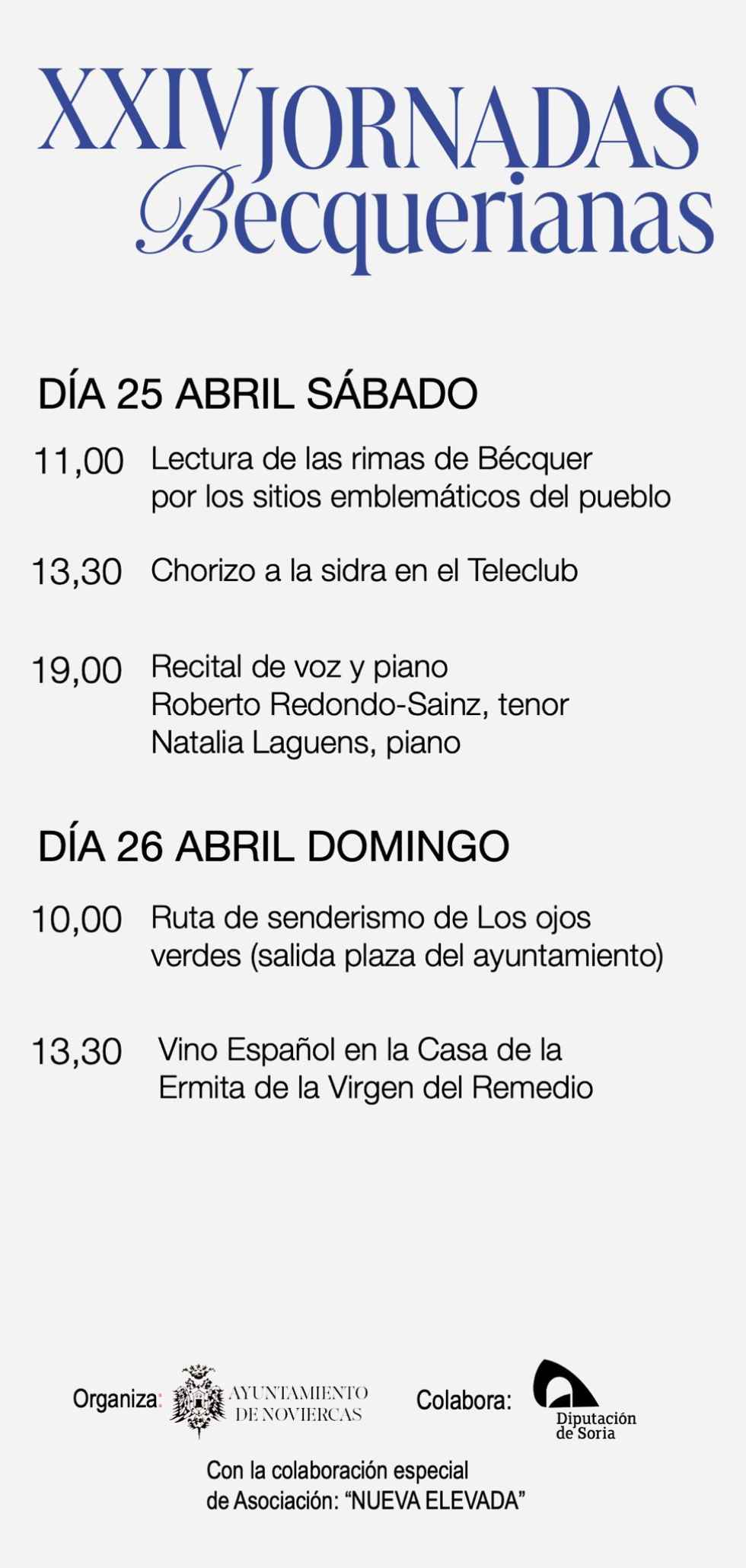 Esta edición, organizada por el Ayuntamiento noviercano y la colaboración de la asociación Nueva Elevada, se abrirá el sábado 25 de abril, por la mañana, con la lectura de las rimas de Bécquer por los sitios emblemáticos del pueblo.