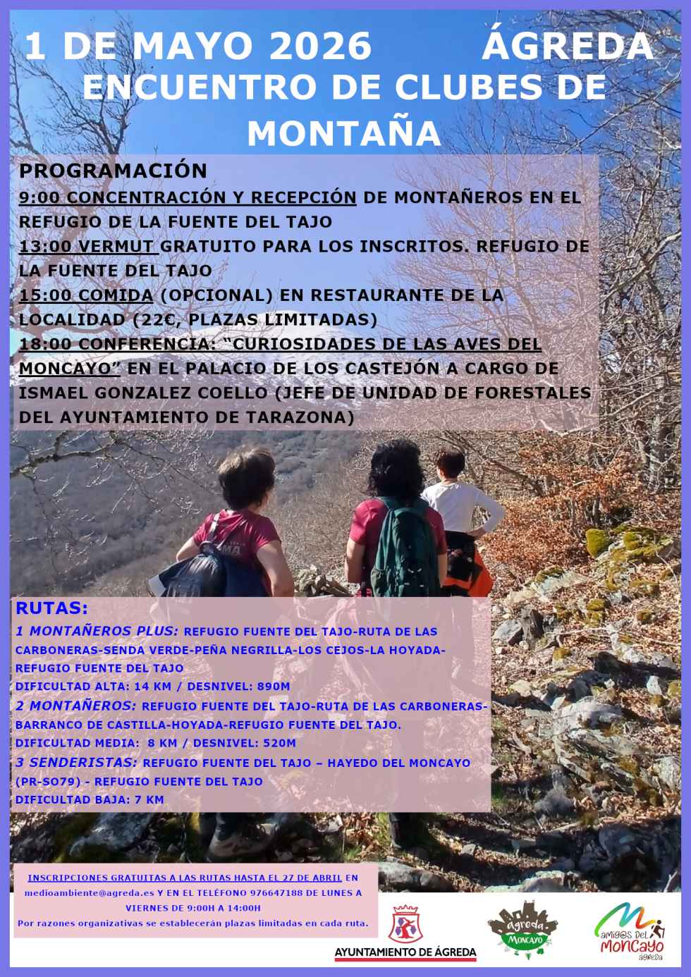 Para inscribirse en las rutas y en la comida, pueden enviar un correo a medioambiente@agreda.es o llamar al 976 647 188, de lunes a viernes, de 9:00 h a 14:00 horas. (Por razones organizativas, se establecerán plazas limitadas en cada ruta).