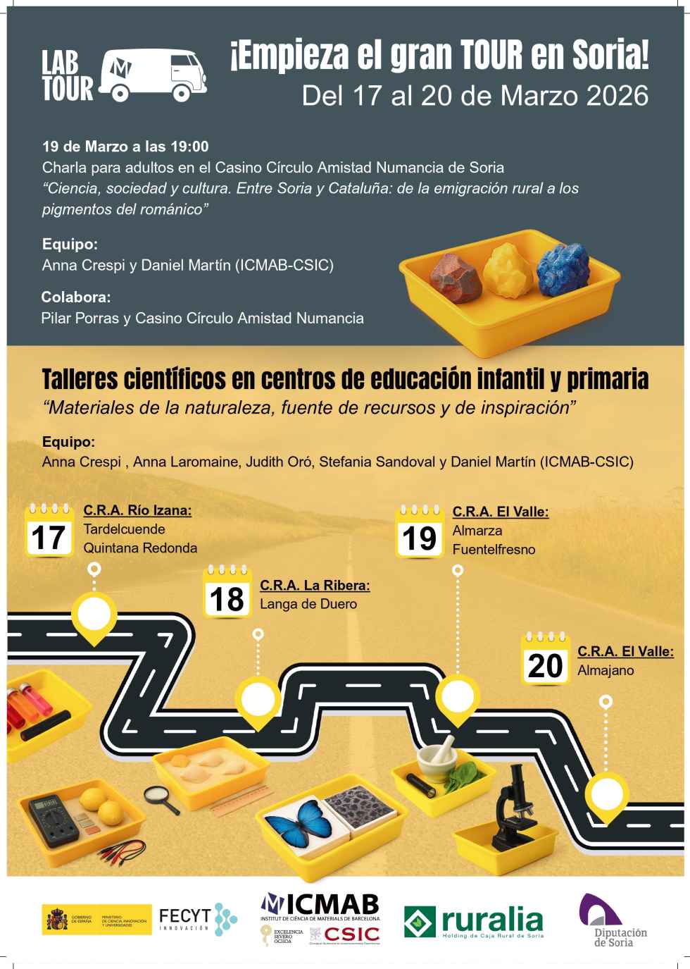 El próximo lunes 16 de marzo un equipo de investigadoras del Instituto de Ciencia de Materiales de Barcelona (ICMAB-CSIC) viajará a Soria en la última fase del proyecto LAB TOUR 2026, financiado por la Fundación Española para la Ciencia y la Tecnología–Ministerio de Ciencia, Innovación y Universidades (FECYT-MICIU), Ruralia, la Diputación de Soria y el ICMAB-CSIC.