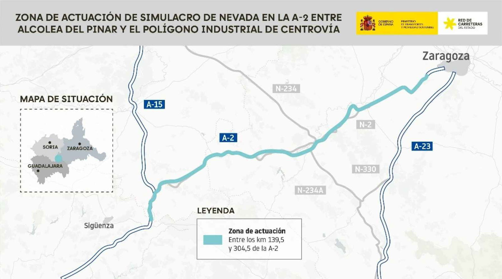 El Ministerio de Transportes y Movilidad Sostenible, junto con las subdelegaciones del Gobierno de Guadalajara, Soria y Zaragoza; y en coordinación con las Administraciones competentes de regulación de tráfico (Dirección General de Tráfico y Guardia Civil de Tráfico) y las empresas concesionarias encargadas de la conservación de la A-2, ha programado la realización de un simulacro de actuación del operativo de vialidad invernal en situación de nevada en el tramo de la autovía A-2 comprendido entre los puntos kilométricos 139,500 y 304,500.