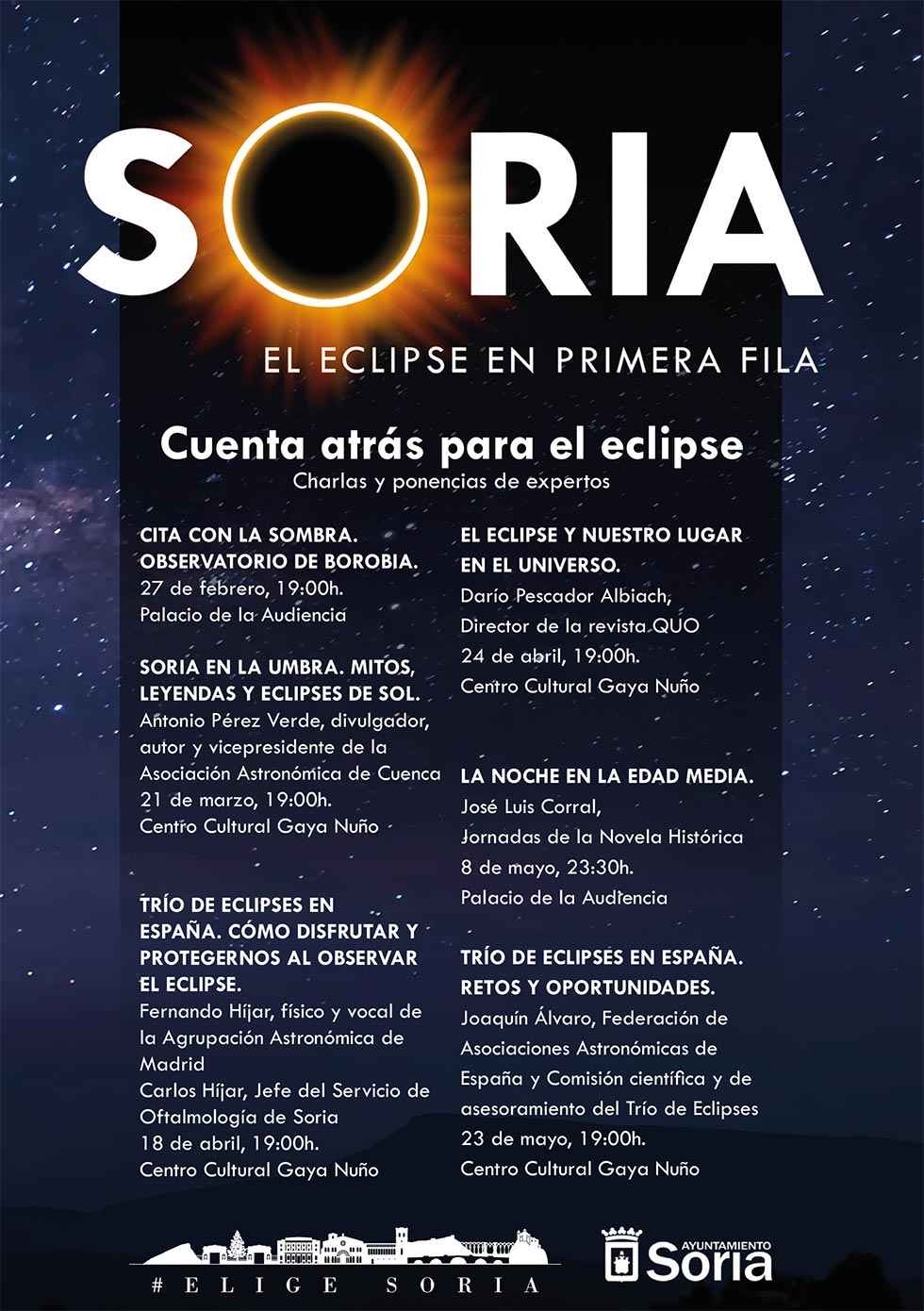 En abril se celebrarán dos nuevas sesiones. El 18 de abril a las 19.00 horas en el Centro Cultural Gaya Nuño tendrá lugar la charla “Trío de eclipses en España. Cómo disfrutar y protegernos al observar el eclipse”, a cargo del físico Fernando Híjar, vocal de la Agrupación Astronómica de Madrid, y del jefe del Servicio de Oftalmología de Soria, Carlos Híjar, quien abordará las recomendaciones médicas necesarias para observar el fenómeno sin riesgos oculares.