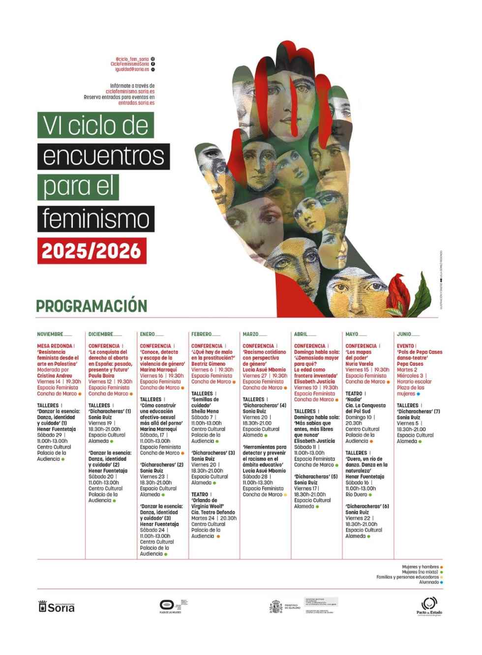 La sexta edición del Ciclo Feminista organizado por el Ayuntamiento de Soria abordará temas como el derecho al aborto, la prostitución, la coeducación o el racismo cotidiano, e incorporará talleres, teatro y actividades intergeneracionales. El ciclo se abre en noviembre con el arte y la resistencia en Palestina.