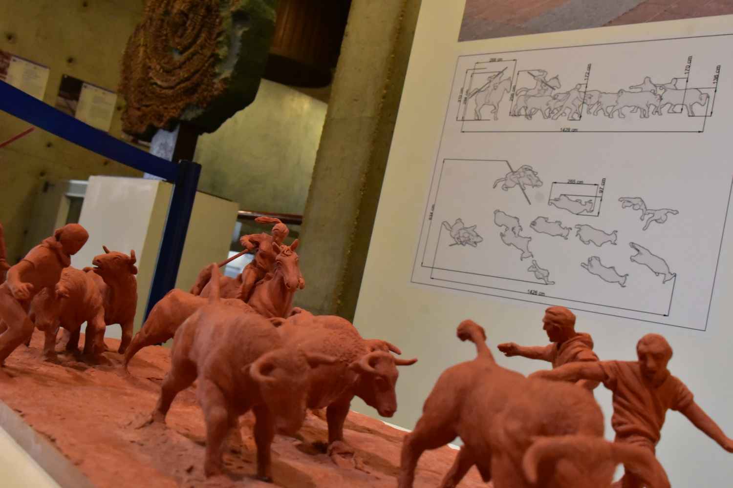 El grupo escultórico esculpido en bronce está compuesto por diecinueve figuras: seis toros de Victorino Martín, tres cabestros y diez corredores.