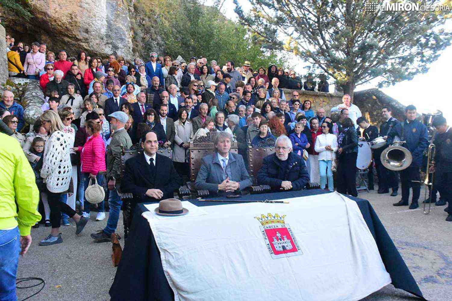 El homenaje, que ha tenido lugar junto a la ermita de San Saturio tras la tradicional misa del programa festivo del patrón de la ciudad, ha contado con la participación del representante del Ateneo de Soria, Juan Antonio Gómez Barrera, la lectura del histórico discurso que Machado publicó días después en la prensa, las palabras del alcalde de Soria, Carlos Martínez, y la actuación final de la Banda Municipal de Música, que ha interpretado una marcha triunfal.