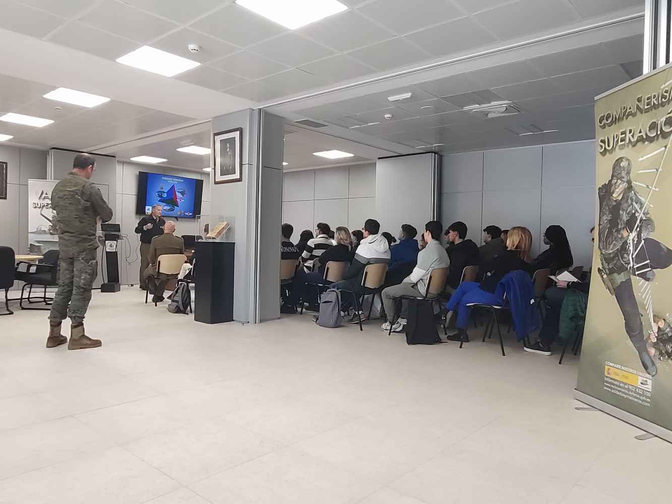 Dicha charla ha sido impartida por el subdelegado de Defensa y el teniente coronel jefe del Departamento de Administración Económica de la Academia General Militar de Zaragoza (AGM), resultando de gran interés para los alumnos, que desconocían esta forma de ingresar en las Fuerzas Armadas.