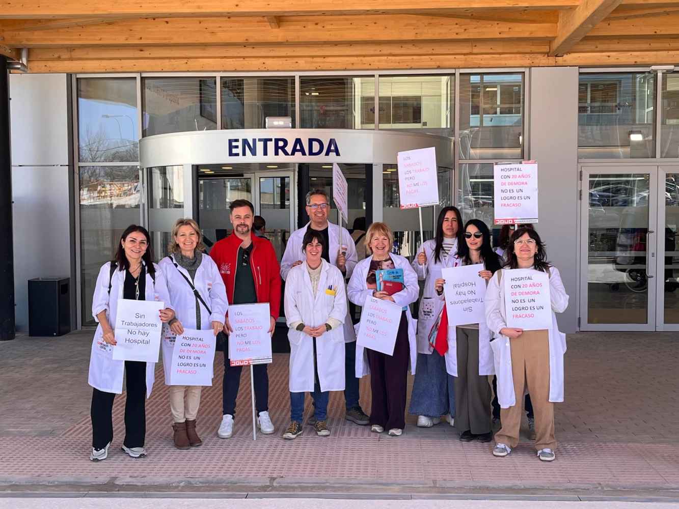 La Federación de Sanidad de CCOO Soria se ha persnado en la entrada principal del Hospital Santa Bárbara en el día de su puesta en servicio con carteles en los que se podía leer “Hospital con 20 años de demora no es un logro es un fracaso”.