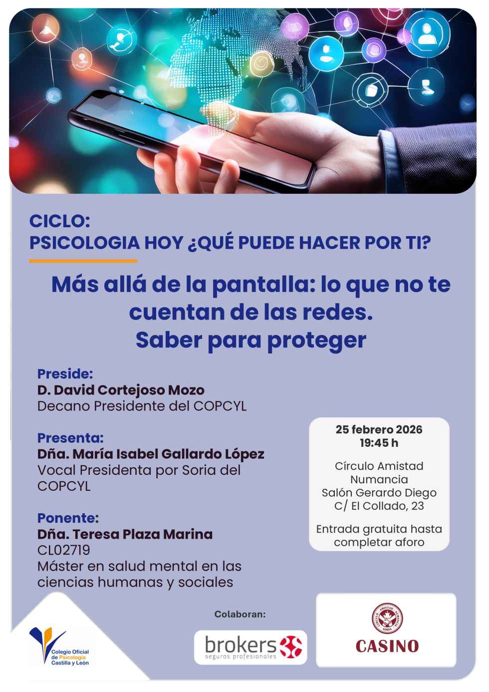 El Colegio de Psicología de Castilla y León (COPCYL) celebrará el miércoles 25 de febrero en Soria la charla ‘Más allá de la pantalla: lo que no te cuentan de las redes. Saber para proteger’ dentro del ciclo ‘Psicología Hoy: ¿qué puede hacer por ti?’.