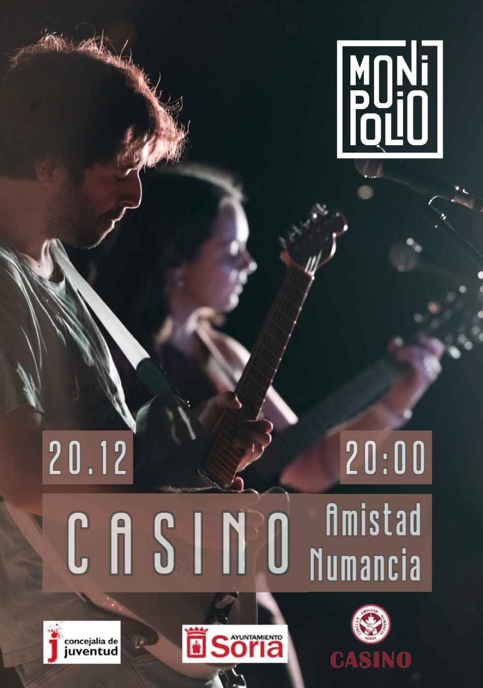 El dúo soriano Monipolio, formado por Mónica Contreras Alonso y Pablo Llorente Mateo, actuará mañana sábado 20 de diciembre a las 20:00 horas en el Casino Amistad Numancia.